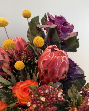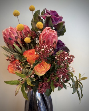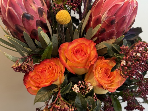 A bold, textural arrangement featuring sculptural protea, warm-toned roses, and playful botanical accents. Designed to feel artful, expressive, and anything but ordinary.