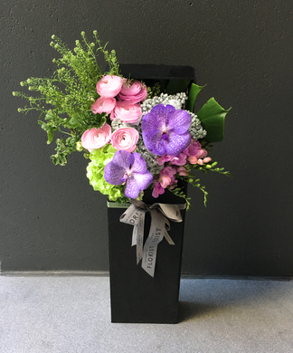 A mixed selection of the the season's finest and freshed cut flowers packaged in San Francisco Florist's signature black wooden box.