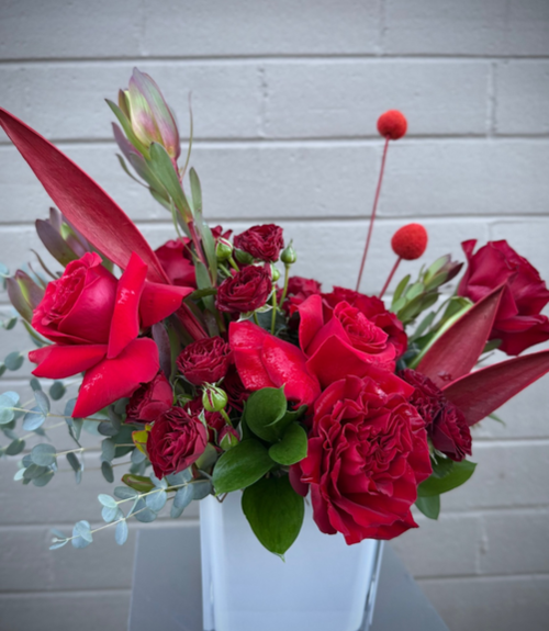 A lavish display of one hundred roses designed in our iconic casablanca style: low, wide, and intentionally abundant.